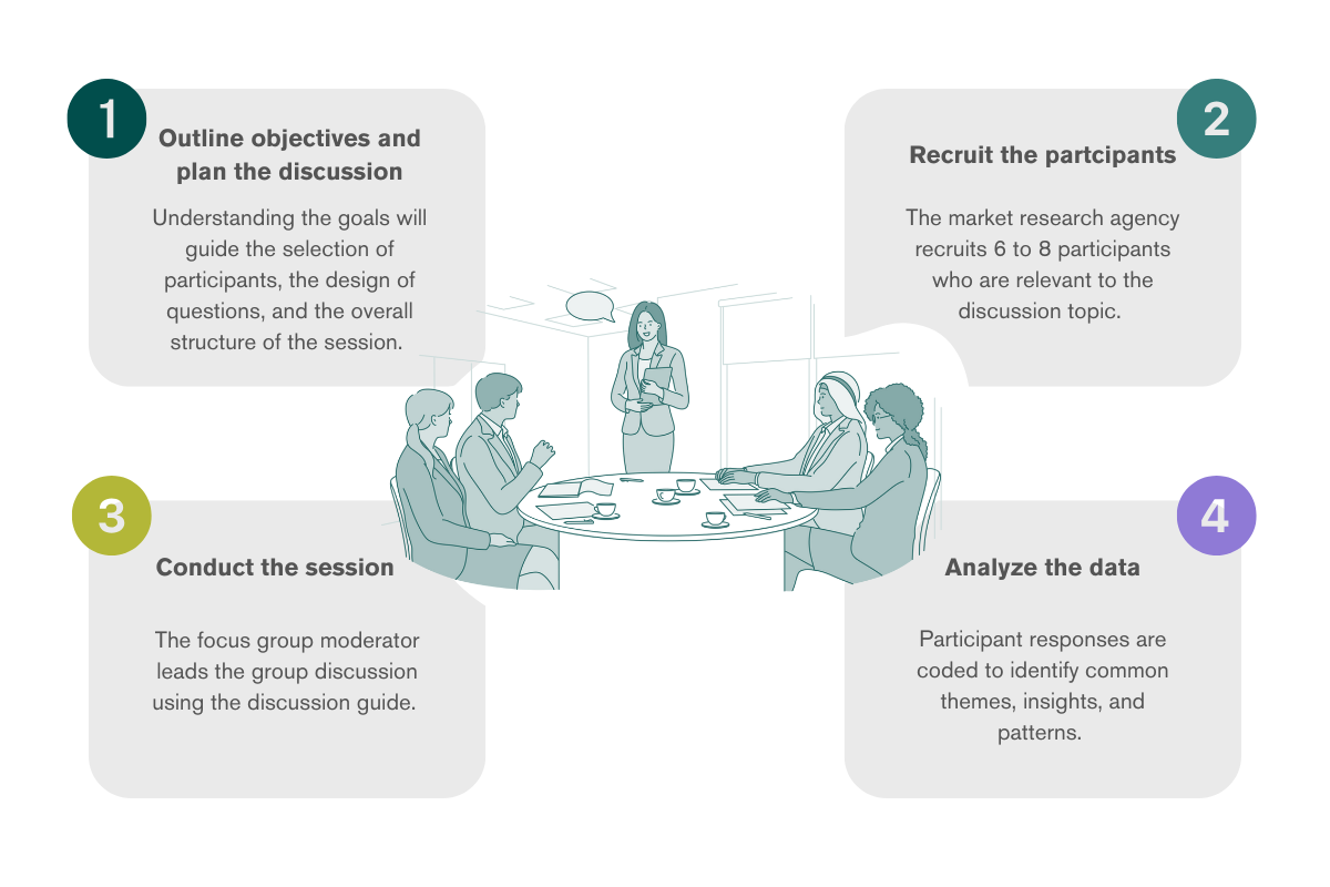 The market research agency recruits 6 to 8 participants who are relevant to the discussion topic. Recruitment can be through social media, customer lists, or a market research agency. The participants are invited to attend the session at a convenient meeting place and time. They are usually paid for their time. It is generally advisable to recruit at least 1-2 more participants than the number desired to attend, in case any of those recruited are not able to attend the session in the end.